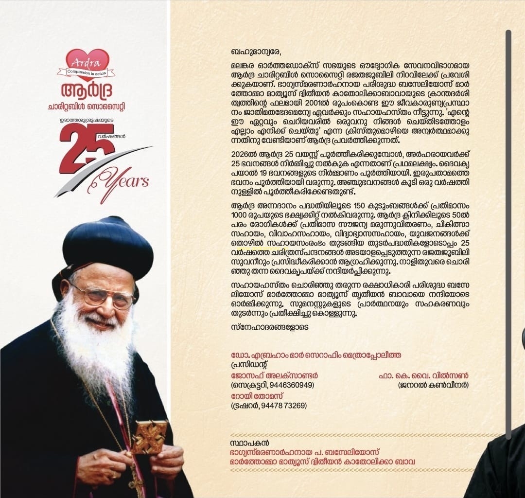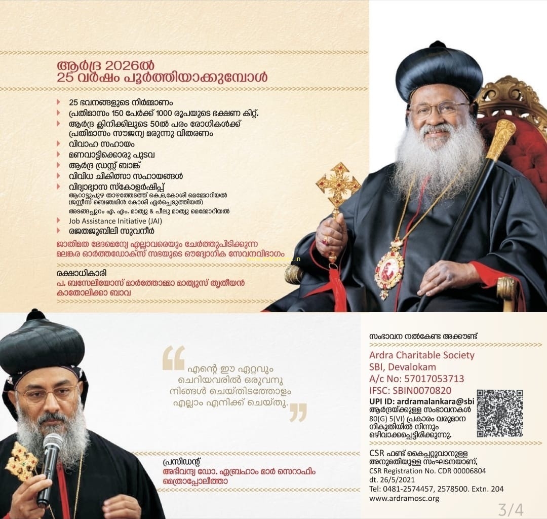"The Society was formed in August 2001, Ardra is under the direct patronage of H.H. Baselios Marthoma Mathews II, Catholicos of the East and Malankara Metropolitan. It is a non-profit charitable organisation operating throughout India."